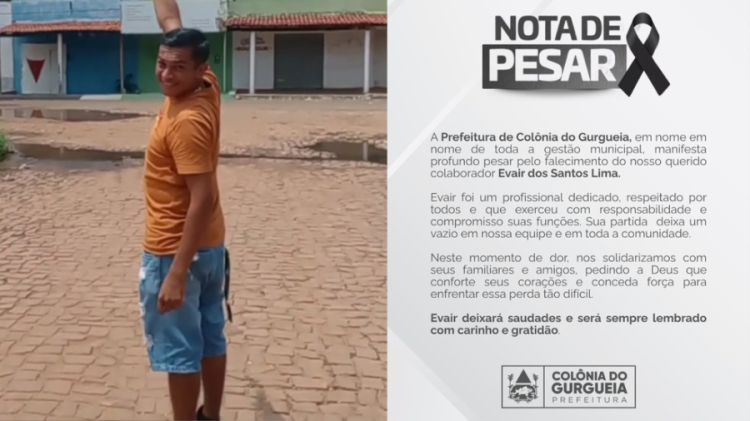 A Prefeitura de Colonia do Gurgueia, em nome de toda a gestão municipal, manifesta profundo pesar pelo falecimento do nosso querido colaborador Evair dos Santos Lima.