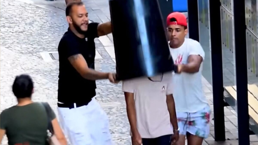 Um dos alvos da "pegadinha" do balde foi um rapaz que, na época, tinha 25 anos. O vídeo foi gravado em 2019 na Avenida Conde da Boa Vista, uma das principais do Centro da cidade. Mesmo sem dar autorização para participar da gravação, o vídeo foi publicado, borrando o rosto do rapaz.