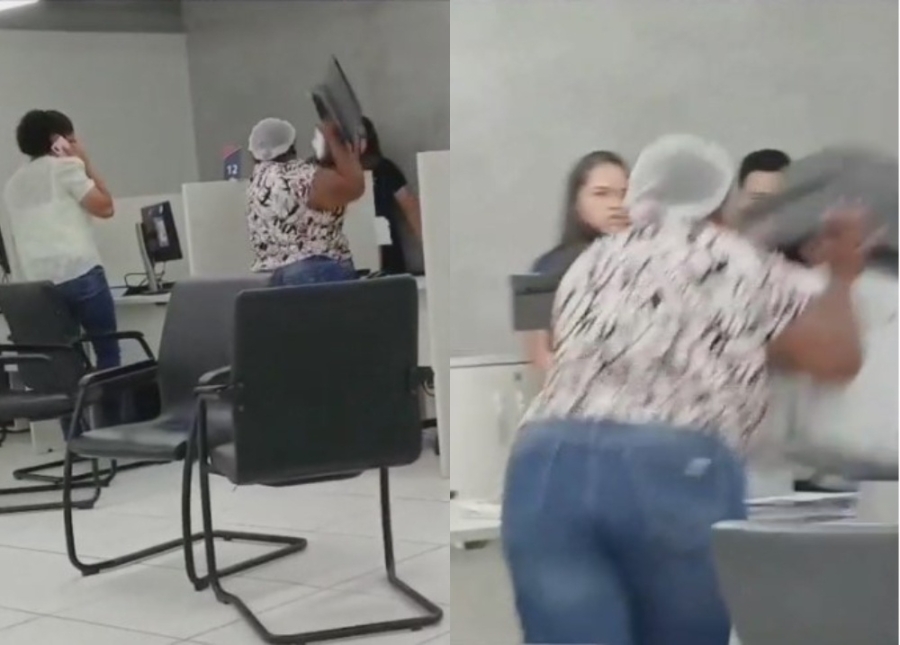 No vídeo, a mulher, visivelmente abalada, derruba nove monitores dos guichês de atendimento e duas impressoras. Em seguida, ela chora e desabafa apoiada em uma mesa: “eu estou cansada, eu não aguento mais”.