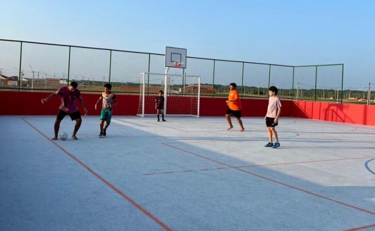 A nova quadra do Caminho do Alvorada já recebeu piso especial, rampa de acessibilidade, iluminação, mureta, alambrado e estrutura completa para práticas esportivas como vôlei, basquete e futsal, promovendo lazer, convivência comunitária e bem-estar.