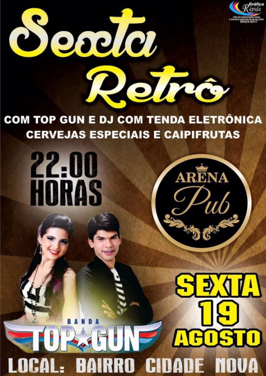 Sexta Retrô com Top Gun e tenda eletrônica com Dj será neste dia 19 de agosto na Arena Pub no Bairro Cidade Nova oferecendo cervejas especiais e caipifrutas para os clientes. O evento está marcado para ás 22h.