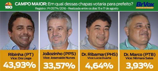 BrVox ouviu 280 eleitores na cidade de Campo Maior entre os dias 15 e 17 de agosto. A pesquisa é registrada no Tribunal Superior Eleitoral com o número PI 05774/2016. Ela possui 94,6% de confiabilidade.