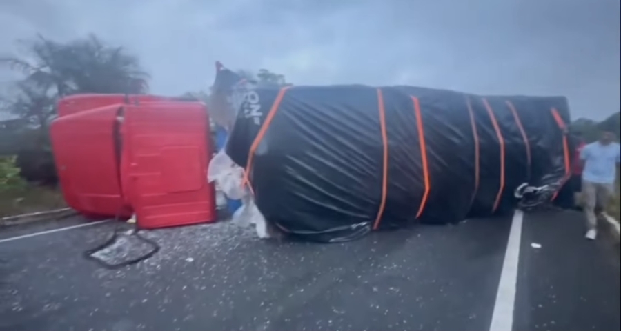 De acordo com as informações preliminares, o motorista foi surpreendido por um animal solto na pista. Para evitar o atropelamento, realizou uma manobra brusca, o que resultou na perda de controle do veículo. O caminhão saiu da faixa de rolamento e tombou.