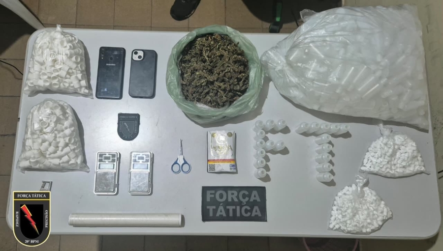 No quarto, foram apreendidos aproximadamente 442 gramas de substância análoga à maconha, além de duas balanças de precisão, um rolo de papel filme, uma tesoura, um pacote de tabaco e 419 frascos plásticos com tampa e dosador.