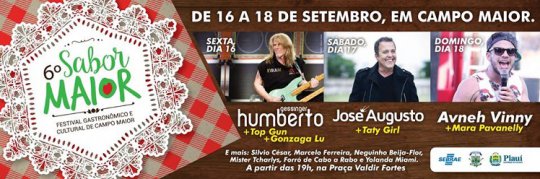 O Sabor Maior se encerra no domingo (18) com mais duas atrações nacional. Avneh Vinny e Mara Pavanelly fecharão o evento. Nos três dias de evento se apresentam ainda os artistas Silvio César, Marcelo ferreira, Neguinho Beija Flor, Mister Tcharlys, Forró de Cabo a Rabo e Yolanda Miami.