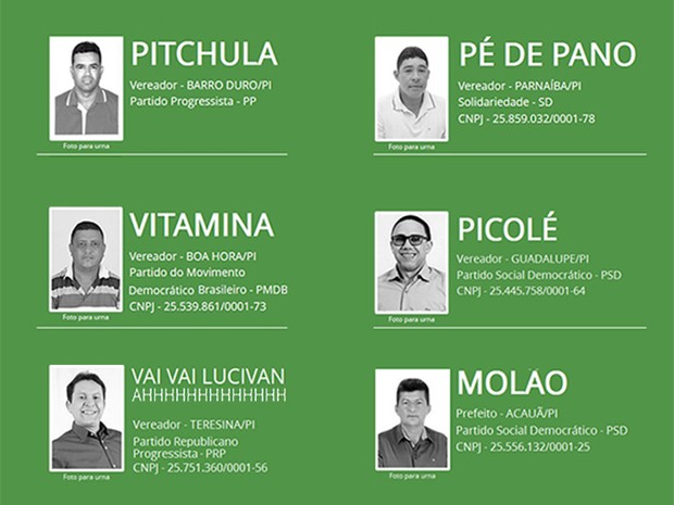A sequência de apelidos registrada pelos políticos oficialmente no sistema do Tribunal Superior Eleitoral (TSE) conta ainda com três candidatos em Parnaíba, segundo maior colégio eleitoral do Piauí. Por lá, Pé de Pano (SD), Gambá (PSL) e Fogoió (PTC) também concorrem a uma vaga de vereador. Em Acauã, o prefeito Molão (PSD) tenta a reeleição e em Guadalupe, Foquito (PDT) quer ser vereador.