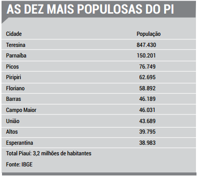 Dez cidades concentram 44% da população do Piauí, segundo o IBGE, que divulgou as estimativas populacionais para 2016 na semana passada. De acordo com o órgão, os dez maiores municípios possuem juntos 1.410.654 habitantes, enquanto que o Estado todo possui 3.212.180. Teresina lidera, com 847 mil habitantes.