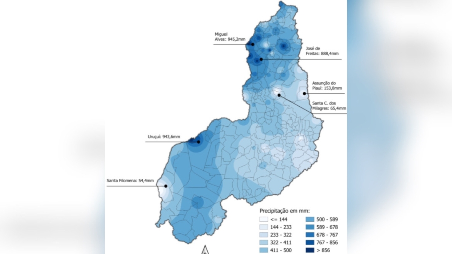 Apesar do trimestre corresponder ao principal período chuvoso, municípios do semiárido, como Santa Cruz dos Milagres e Assunção do Piauí, registraram baixos acumulados, reforçando a característica de irregularidade das chuvas no estado.