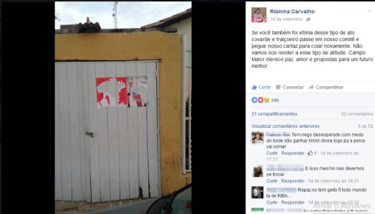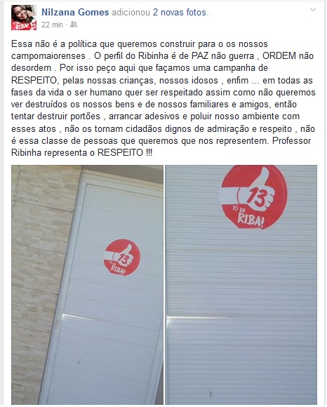 Em sua postagem no facebook Nilzana disse “Essa não é a política que queremos construir para os nossos campomaiorenses. O perfil do Ribinha é de PAZ não guerra, ORDEM não desordem. Por isso peço aqui que façamos uma campanha de RESPEITO, pelas nossas crianças, nossos idosos, enfim... em todas as fases da vida o ser humano quer ser respeitado assim como não queremos ver destruídos os nossos bens e de nossos familiares e amigos, então tentar destruir portões, arrancar adesivos e poluir nosso ambiente com esses atos , não os tornam cidadãos dignos de admiração e respeito , não é essa classe de pessoas que queremos que nos representem. Professor Ribinha representa o RESPEITO !!!”.