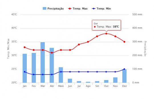 Segundo o Instituto Nacional de Meteorologia – INMET -, o mês de outubro será o mês mais quente desse ano no município. A média de temperatura é de 38°. O calor cresceu acentuadamente desde o mês de Junho. A previsão é que as altas temperaturas diminuam nos dois últimos meses do ano.
