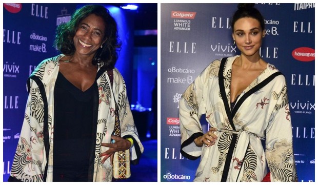 Glória Maria tirou de letra o fato de participar do Elle Fashion Preview usando o mesmo look de Débora Nascimento. Ambas escolheram um quimono da grife Cris Barros, com estampa étnica, para prestigiar o evento, que aconteceu na noite desta terça-feira, 11, no Rio de Janeiro. No evento, enquanto Glória usou a peça aberta com uma blusa preta, Débora escolheu usar o look fechado, com um decote poderoso.