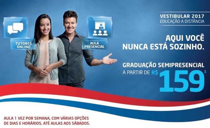 E sabe por que fazer graduação semipresencial na Unopar é diferente? Além de estudar fazendo seus horários e ter o apoio de um tutor online para tirar dúvidas, você tem aula com a sua turma: só na Unopar as aulas presenciais são transmitidas ao vivo com o professor. Educação à distância assim, só na Unopar. E cursos a partir de cento e cinquenta e nove reais. Consulte condições.