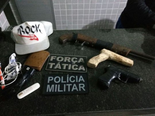 Depois de investigações, os policiais chegaram aos suspeitos na localidade Porção 2, zona rural de Campo Maior. No local, a polícia encontrou a motocicleta, uma espingarda garrucha e dois simulacros de arma de fogo. Outras três pessoas estavam na companhia de Pequeno, mas com a chegada da polícia, fugiram.