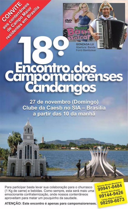 Acontece no domingo, 27 de novembro, em Brasília, o Encontro dos Campomaiorenses Candangos. O evento que chega a 18ª edição seguida busca reunir este ano cerca de 500 pessoas naturais de Campo Maior que residem na capital federal.