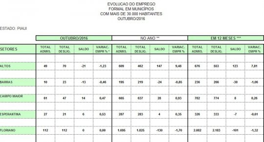 Segundo o balanço, União foi a cidade com pior desempenho. Durante o mês, o município gerou 24 empregos de carteiras assinadas, contudo, 1.257 pessoas foram desempregadas, o que deixa um salto negativo de 1.233. Teresina vem logo depois com -500 empregos, Piripiri com -42 e Altos com -21. Ao todo, o Piauí perdeu apenas no mês passado 1.769 vagas de trabalho.