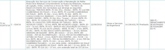 O mural de licitação do site do Tribunal de Contas do Estado do Piauí traz uma licitação concluída, realizada em 22/08/2016 para obras e Serviços de Engenharia, feita pelo Departamento de Estradas de Rodagem do Piauí (DER). A licitação é para a Execução dos Serviços de Conservação e Manutenção da Malha Rodoviária Estadual compreendendo as Rodovias Estaduais, Acessos de Ligação, Anéis, Contornos e Arcos do TD-03 (Território de Desenvolvimento dos Carnaubais) que abrange vários trechos, entre eles “fim da pavimentação - Jatobá do Piauí – 8 km; fim da pavimentação – entroncamento da PI-320 – 16 km; entroncamento da PI-320 - Sigefredo Pacheco – 11 km; Boa Hora - Boqueirão do Piauí – 11 km; Boqueirão do Piauí – entroncamento da BR-343 – 21 km; totalizando uma extensão de 337,00 km.