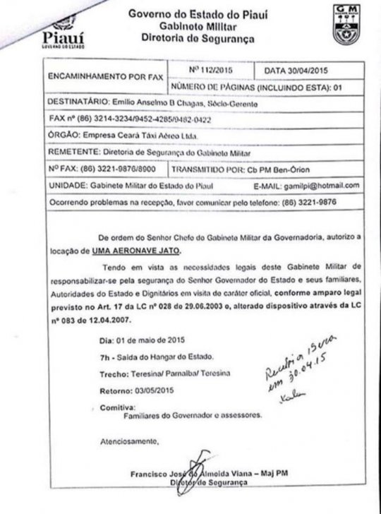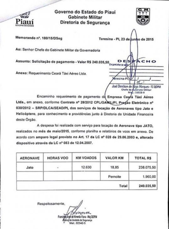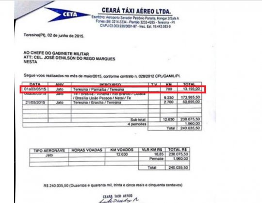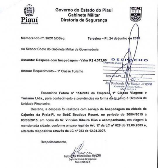 Constam nos documentos (postados logo abaixo) que no mês de maio o Gabinete Militar, órgão responsável por despesas básicas do governador, autorizou o pagamento do aluguel de um jatinho, no valor R$ 13.195,00, de 01 a 03 de maio de 2015, (de sexta a domingo) para uma viagem de Vinicius Dias ao litoral piauiense. Ainda de acordo com os documentos, na mesma data foi pago ainda, também pelo governo do Estado, a estadia de Vinicius na Resort BobZ, ao custo de R$ 4.072,00.