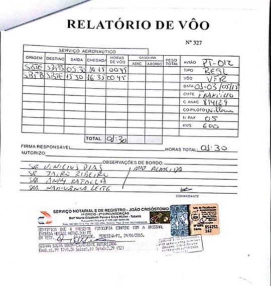 Observem ACIMA, NO RELATÓRIO DE VÔO em "observação de bordo" que constam apenas os nomes de Vinícios Dias, Jairo Ribeiro, Anny Rafaela (esposa de Vinícios), Narivânia Leite e outra pessoa com sobrenome Almeida. Não constam nem o nome de Wellington Dias, nem de sua esposa Rejane Dias, nem dos outros dois filhos do casal, Daniele e Yasmin.