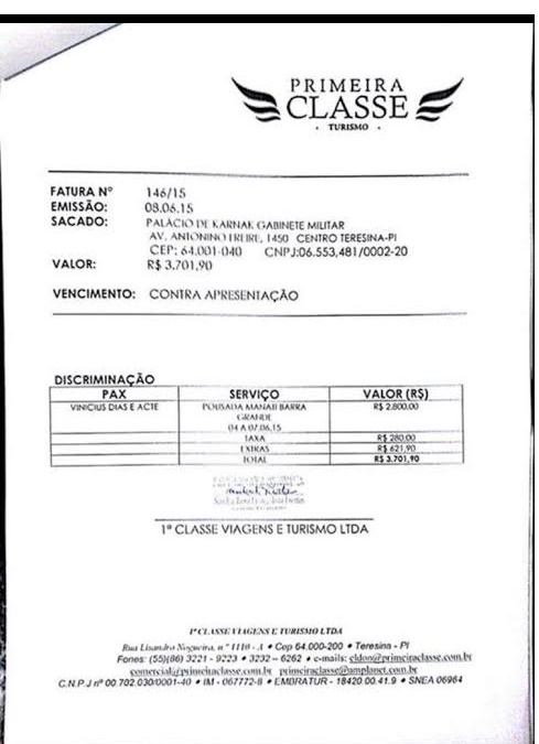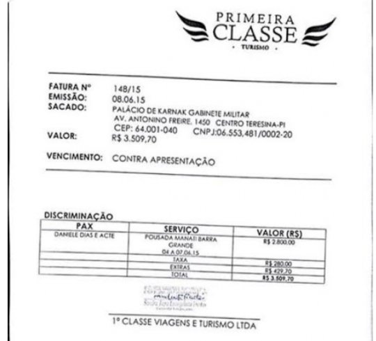 Nos documentos divulgados, aparece um despacho de encaminhamento de fatura para o pagamento de R$ 4.072,00 referente à hospedagem no Resort BobZ, em nome de Vinícios Ribeiro Dias e acompanhante, referente a viagem do mês de maio. Em se tratando de viagem oficial, a nota de empenho para pagamento não deveria sair em nome do gabinete militar, do cerimonial?