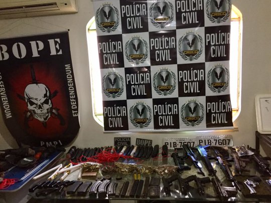 Dentro da casa foram encontrados 3 carros roubados, 4 fuzis, 3 submetralhadoras, 3 pistolas e 2 revólveres, 28 bananas de dinamites e equipamentos que auxiliariam na explosão de cofres.