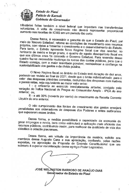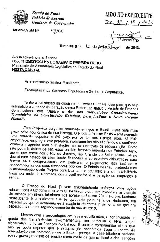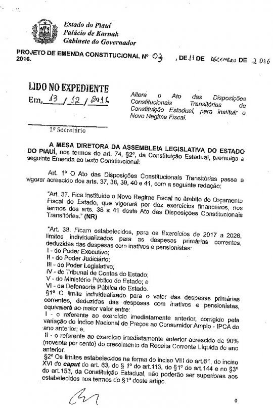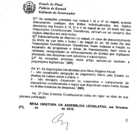 E não adiantou protestos e ameaças de greve por parte das categorias. O governador Wellington Dias (PT) conseguiu que o Projeto de Emenda Constitucional nº 03/2016, chamada de "PEC dos Gastos", ou "PEC da maldade", como diz sindicalistas, fosse aprovado pelos deputados estaduais do Piauí nesta segunda-feira (26/12).
