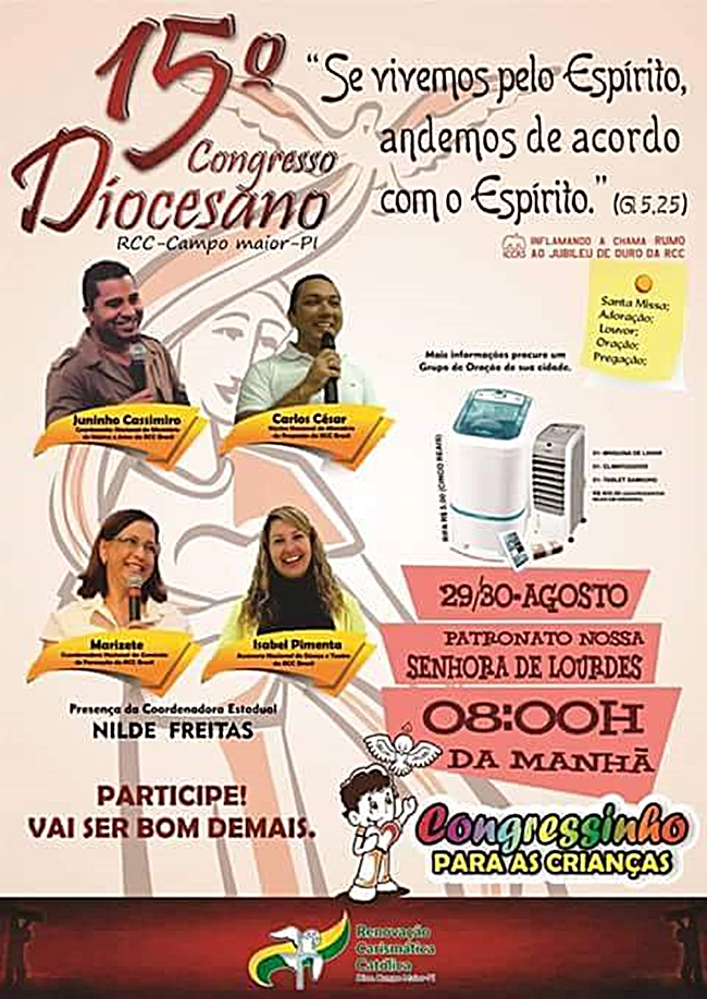 A Renovação Carismática Católica da Diocese de Campo Maior realizará neste próximo final de semana, dias 29 e 30, o XV Congresso Diocesano de Campo Maior.