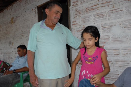 Ana Beatriz com avô materno, senhor Chico Doca, recepcionando as pessoas que chegam na casa e indo passear de carro, um de seus grandes desejos