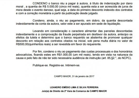 Na senten?a, o juiz da 2? Vara da comarca de Campo Maior, Leandro Em?dio Lima e Silva Ferreira, entendeu que os empr?stimos n?o foram firmados pela cliente. ?? evidente que os descontos nos proventos da autora relativos ao pagamento dos contratos s?o indevidos, visto que s?o fruto de neg?cios jur?dicos inexistentes?, disse.?