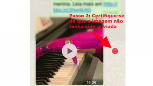 Agora, de volta à mensagem no WhatsApp: se a foto, vídeo ou arquivo não foi mesmo enviado, você verá um sinal exclamação vermelho à direita da imagem, o que indica no iPhone que o aplicativo não completou a ação.