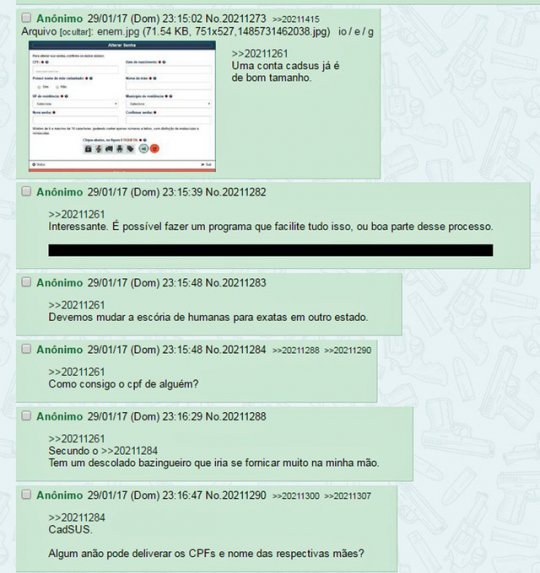 Na noite de domingo (29), no último dia de inscrições do Sisu, internautas combinaram, por meio de um fórum anônimo, uma ação para aproveitar uma brecha de segurança no sistema de recuperação de senhas do Enem 2016: buscando dados pessoais de candidatos do Enem, como CPF, nome da mãe e data de nascimento, eles poderiam criar uma nova senha de acesso de cada candidato no sistema do Enem, que é integrado ao sistema do Sisu.A ação se espalhou depois de surgir no Facebook, em um grupo fechado conhecido por organizar ataques contra alvos específicos.No caso do Sisu, os internautas usaram como alvos estudantes que se destacaram no Enem 2016. Mas, nas conversas registradas nos sites, eles também discutem estratégias como buscar dados de pessoas que conhecem e que sabem que fizeram o Enem. Veja o relato dos cinco estudantes que denunciaram a invasão ao G1, e a resposta do MEC sobre cada caso: