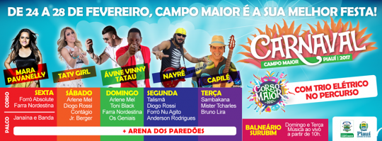 O Corso abre o Carnaval de Campo Maior na sexta, dia 24 de fevereiro. No mesmo dia, no Complexo Valdir Fortes, se apresenta Mara Pavanely. No sábado (25), é à vez de Taty Girl. Avine Vinny e Tatau se apresentam do domingo (26). A festa prossegue na segunda (27) com Nayrê. Capilé encerra o Carnaval de Campo Maior na terça (28).