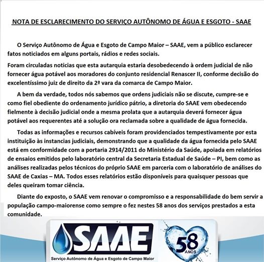 Após uma manifestação realizada na última sexta (3), onde protestantes pediam o cumprimento de uma ordem judicial na qual o SAAE deveria fornecer água mineral a moradores do bairro Renascer II, o Serviço Autônomo de Água e Esgoto de Campo Maior se manifesta rebatendo as acusações e afirmando que está cumprindo a decisão.