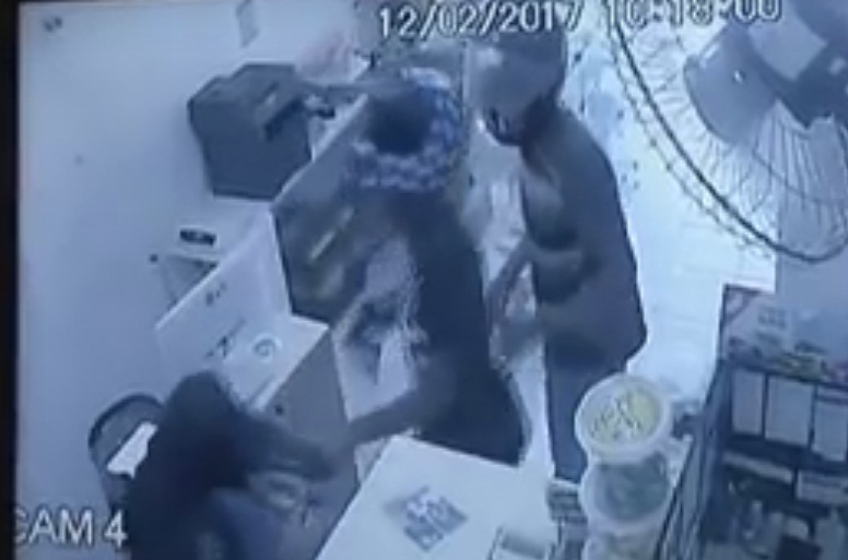 O proprietário, que aparece deitado no chão, recebe coronhadas na cabeça. "No momento que eu entrei na loja eles pediram para eu deitar. Uma cliente entrou no banheiro e um deles arrombou a porta e arrastrou ela pelos cabelos. Eles fizeram um arrastão, deram coronhadas na minha cabeça e na cliente. Eles eram agressivos", contou, ainda bastante abalado.