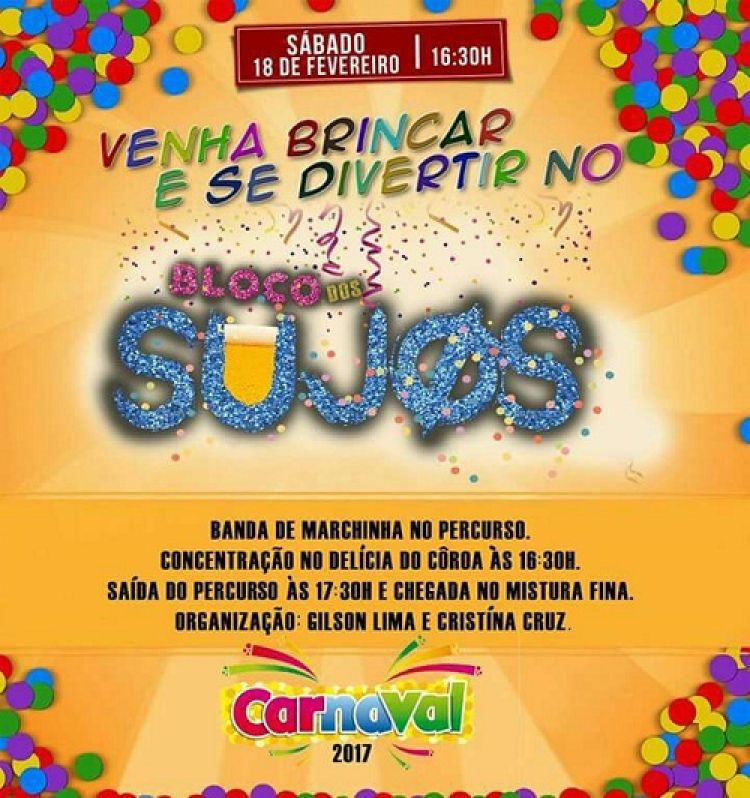 A prévia carnavalesca do Bloco Dos Sujos acontece neste sábado (18). A concentração acontece às 16:30 no Delícia do Coroa. Logo depois o bloco ganha às ruas e chega até o Mistura Fina. Uma Banda de Marchinhas acompanha os foliões durante todo trajeto.