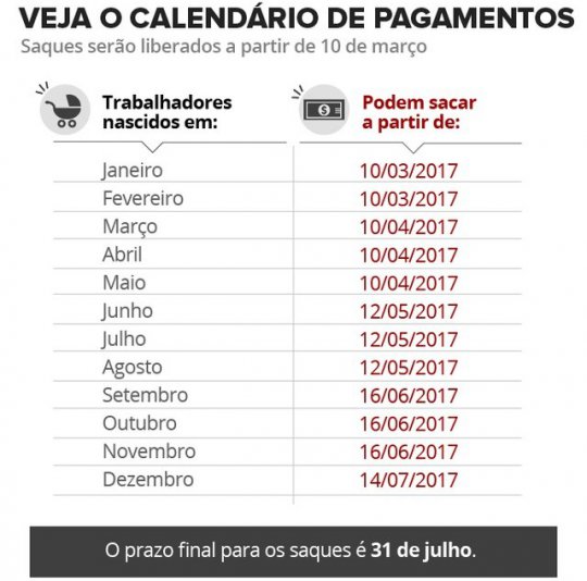 Os saques começam no dia 10 de março, para nascidos em janeiro e fevereiro. Pessoas nascidas em março, abril e maio poderão sacar em abril. Quem faz aniversário em junho, julho e agosto, poderá sacar em maio. Nascidos em setembro, outubro e novembro poderão fazer o saque em junho. Em julho, deverão sacar os nascidos em dezembro.