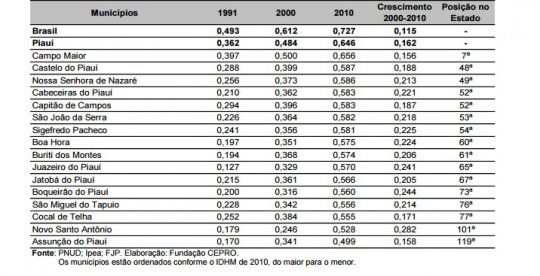 Já o Piauí, saltou da 27ª posição em 1991 para 24º lugar em 2010, superando os estados, Maranhão e Alagoas e no mesmo patamar do estado do Pará.