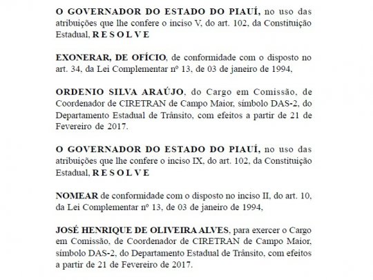 Através de decreto, Wellington exonerou Ordênio Araújo, atual coordenador do órgão do Departamento Estadual de Trânsito. No mesmo documento, o governador nomeia Zé Henrique para o cargo.