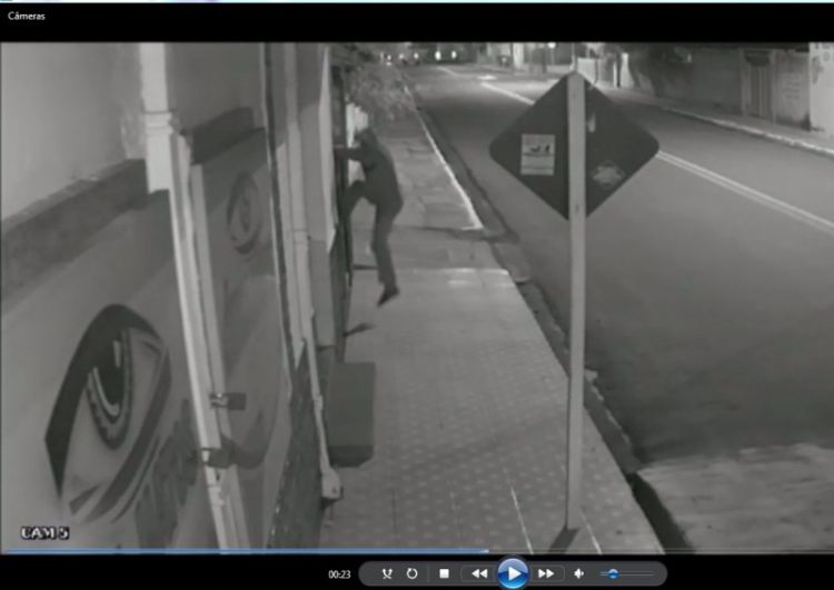 Era quase meia noite da quata-feira do dia 22 de fevereiro, quarta-feira da semana passada, quando um homem caminha pela avenida, vindo do lado da BR-343. Usando boné e com parte do rosto coberto pela camisa, ele sobe na grade de proteção da porta da loja e arranca uma das câmeras de segurança do local, indo embora no sentido aos Correios.