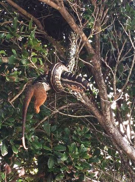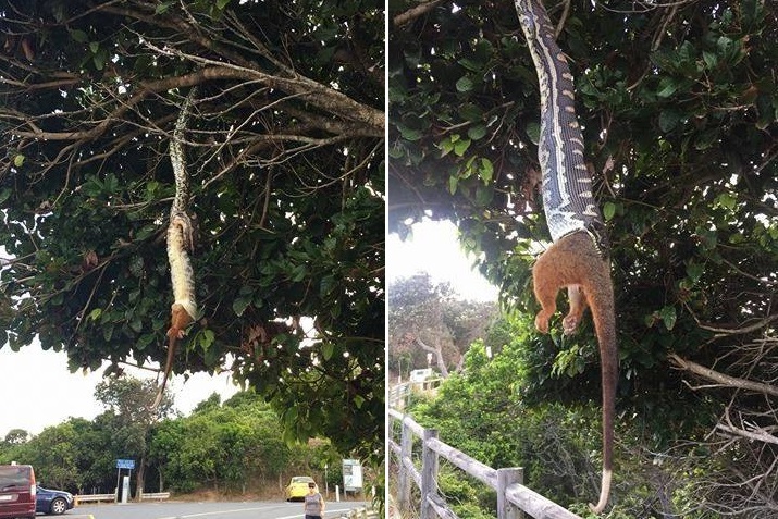 Fotos tiradas pelas irmãs Simone e Michelle Hunjak registraram o momento em que uma cobra píton, pendurada nos troncos de uma árvore, engole um que seria um gambá ainda inteiro. A cena aconteceu no último domingo (26), na região de Baía de Byron, em Nova Gales do Sul, na Austrália.