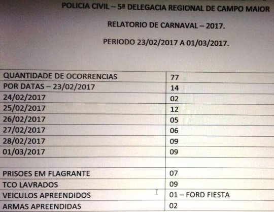 O comando do Policia Militar divulgou nesta quinta-feira (02/03) o balanço do policiamento ostensivo durante os cinco dias de carnaval em Campo Maior. Foram realizadas 30 conduções aos distritos policiais por diversos motivos: vias de fato, ameaça, furto, distúrbio em via pública, e porte de arma branca; 12 armas brancas apreendidas; e apreensão de entorpecentes.