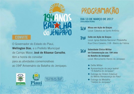 Inaugurações, celebrações religiosas, peça teatral e ato cívico-militar marcam as comemorações da Batalha do Jenipapo, em Campo Maior, no próximo dia 13 de Março. A data lembra os 194 anos da batalha sangrenta travada entre tropas piauienses e portuguesas. Com cinco horas de duração, o confronto permitiu a independência do norte e nordeste do Brasil.