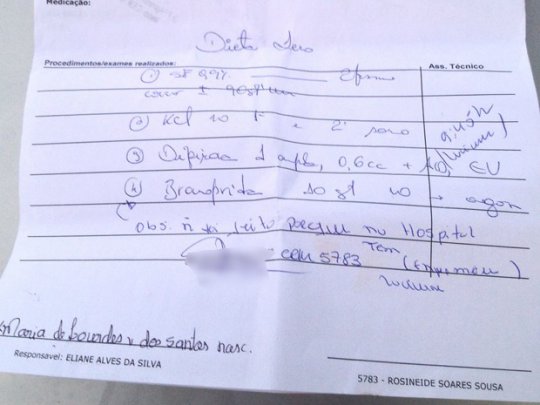 A reportagem entrou em contato com a Secretaria Estadual de Saúde, mas a assessoria disse que ainda não poderia fornecer informações sobre a prescrição médica porque estava aguardando um contato da diretora do Hospital, Jardenia Ribeiro. Porém, a prescrição foi divulgada pela mãe da criança. A assessoria falou ainda que uma equipe do Hospital foi deslocada até a casa da criança para colher informações.