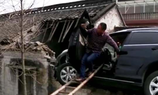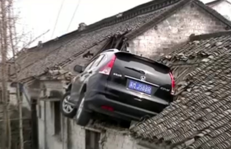 Um motorista perdeu o controle de carro e foi para em telhado de casa localizada no leste da China. Conduzindo um SUV Honda CR-V, o homem disse ter tentado evitar um acidente, mas acabou pisando no acelerador por acidente ao mudar de direção.