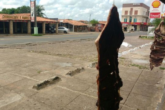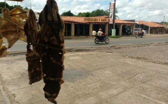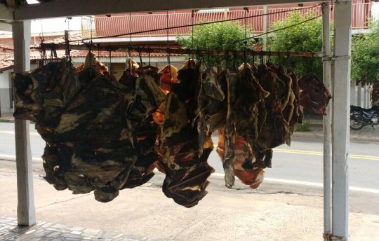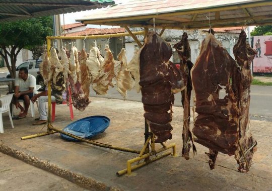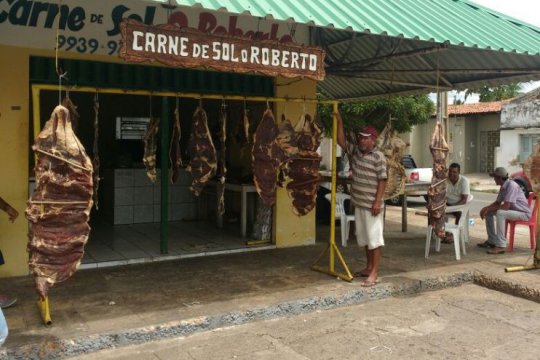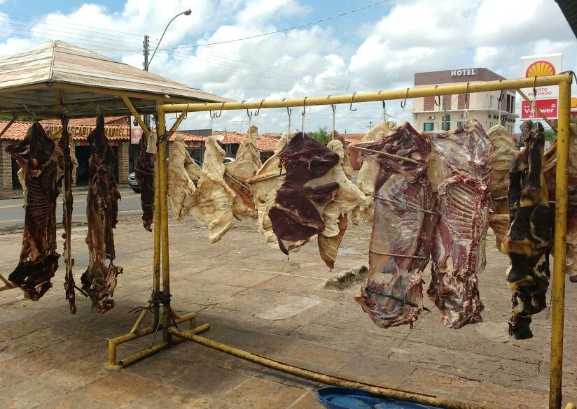 [... O Nordeste continua a desidratar a carne à moda antiga, mas agora prefere empregar um método diferente. Utiliza toda a carcaça bovina, pulverizada com menor quantidade de sal. Submete-a a tratamento rápido. O alimento fica internamente úmido. A carne também pode ser caprina ou ovina. Denomina-se o produto final de carne de sol, carne do sertão ou carne de vento.