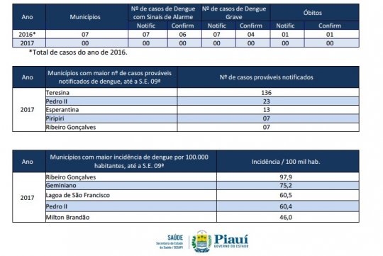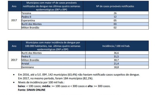 Lago de São de Francisco e Milton Brandão, Ribeiro Gonçalves e Geminiano, foram os municípios que tiveram a maior incidência da doença por grupo de habitantes proporcional a 100 mil. Já Teresina, Pedro II, Esperantina, Piripiri e Ribeiro Gonçalves são as cidades que registraram mais casos de dengue durante o período.