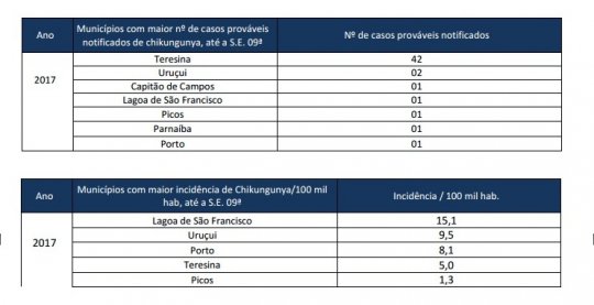 Houve aumento no número de casos de febre chikungunya, que chegou neste ano a 49 registros neste ano contra 37 do ano passado. Houve pacientes com a doença em apenas sete cidade do Piauí, sendo que Teresina concentrou quase todos os casos (42). Não foi registrado nenhuma morte por chikungunya em 2017.