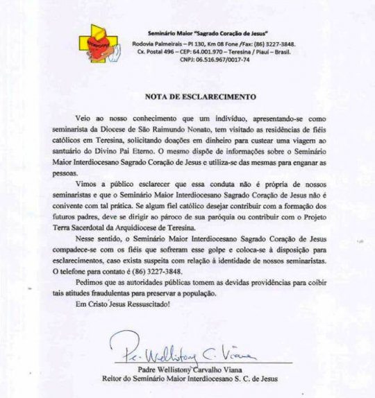 O Seminário Maior Sagrado Coração de Jesus emitiu nota de esclarecimento nessa terça (18) denunciando o golpe. Padre Wellistony Carvalho Viana, Reitor do Seminário, afirmou que nenhum seminarista atua dessa forma – pedindo dinheiro de casa em casa. O Padre pediu que a polícia investigue a denúncia.