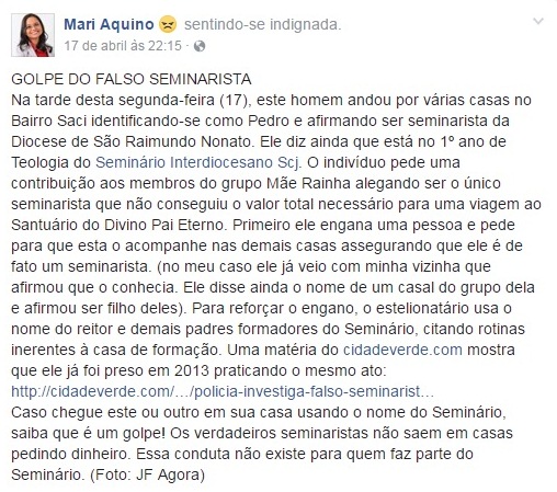 O relato de Mari Aquino diz ainda que o campomaiorense usava pessoas religiosas, conhecidas no bairro, para lhe acompanhar nas casas. “Primeiro ele engana uma pessoa e pede para que esta o acompanhe nas demais casas assegurando que ele é de fato um seminarista (...) Para reforçar o engano, o estelionatário usa o nome do reitor e demais padres formadores do Seminário”, escreveu.