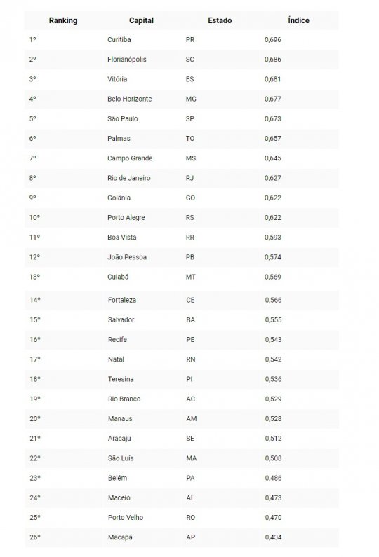 João Pessoa é a 12ª no ranking, mas entre as capitais do nordeste fica com os melhores números. A capital da Paraíba marcou 0,574 pontos.