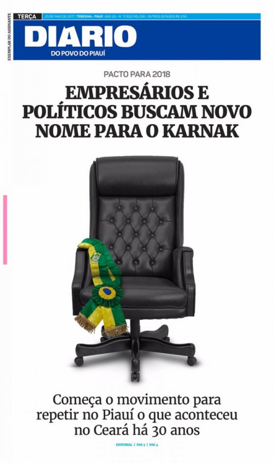 Depois de uma série de denúncias contra o governo Wellington Dias, o jornal Diário do Povo chegou cedo às bancas na última terça (23) com uma revelação: “Empresários e políticos buscam nome para o Karnak”. Na capa, uma cadeira vazia e a faixa de governador estendida sobre ela sugeria que Wellington não terá vida fácil em seu projeto de reeleição.
